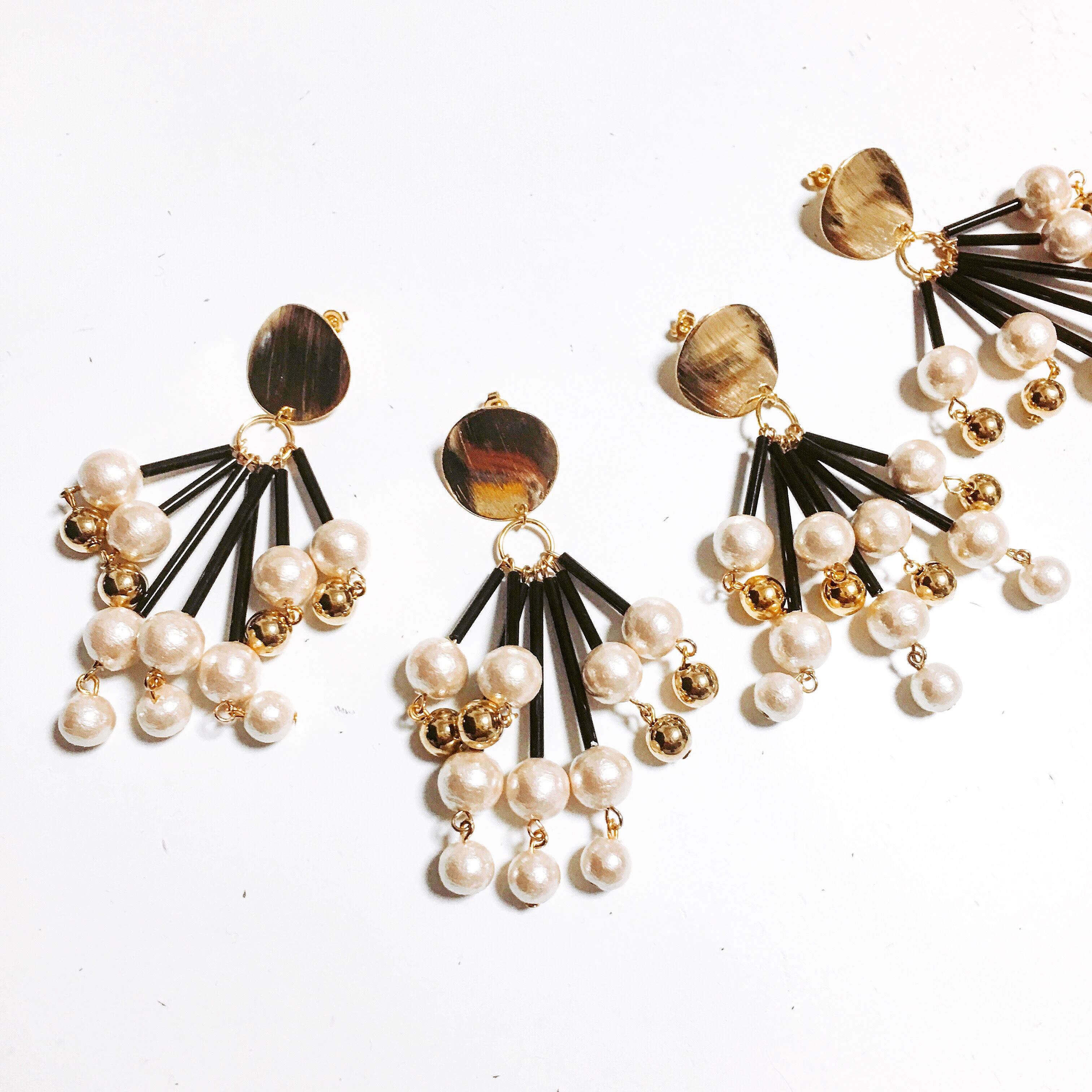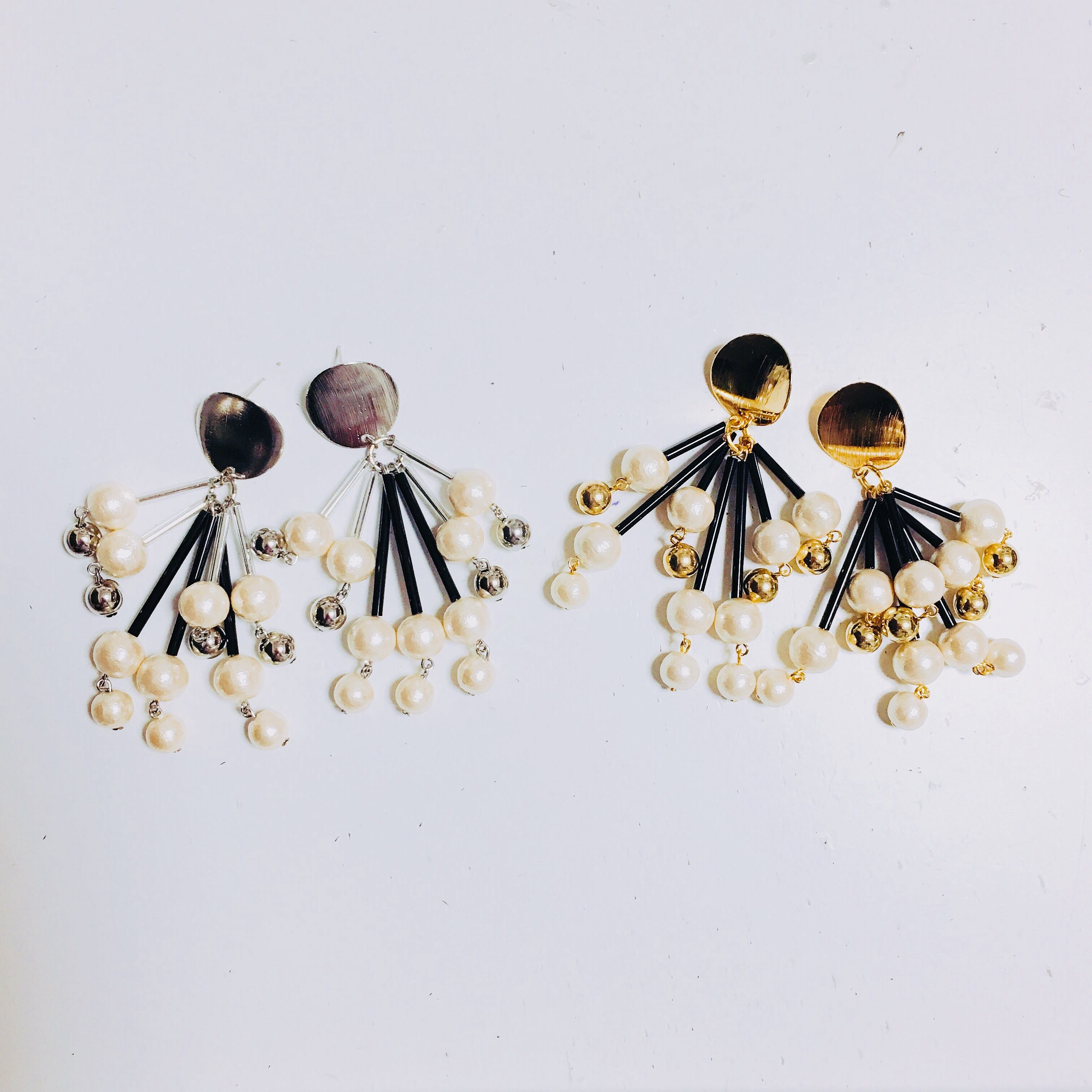 メタリックなシルバー・ゴールドボールとコットンパールをたくさん組み合わせた存在感あるアクセサリー。