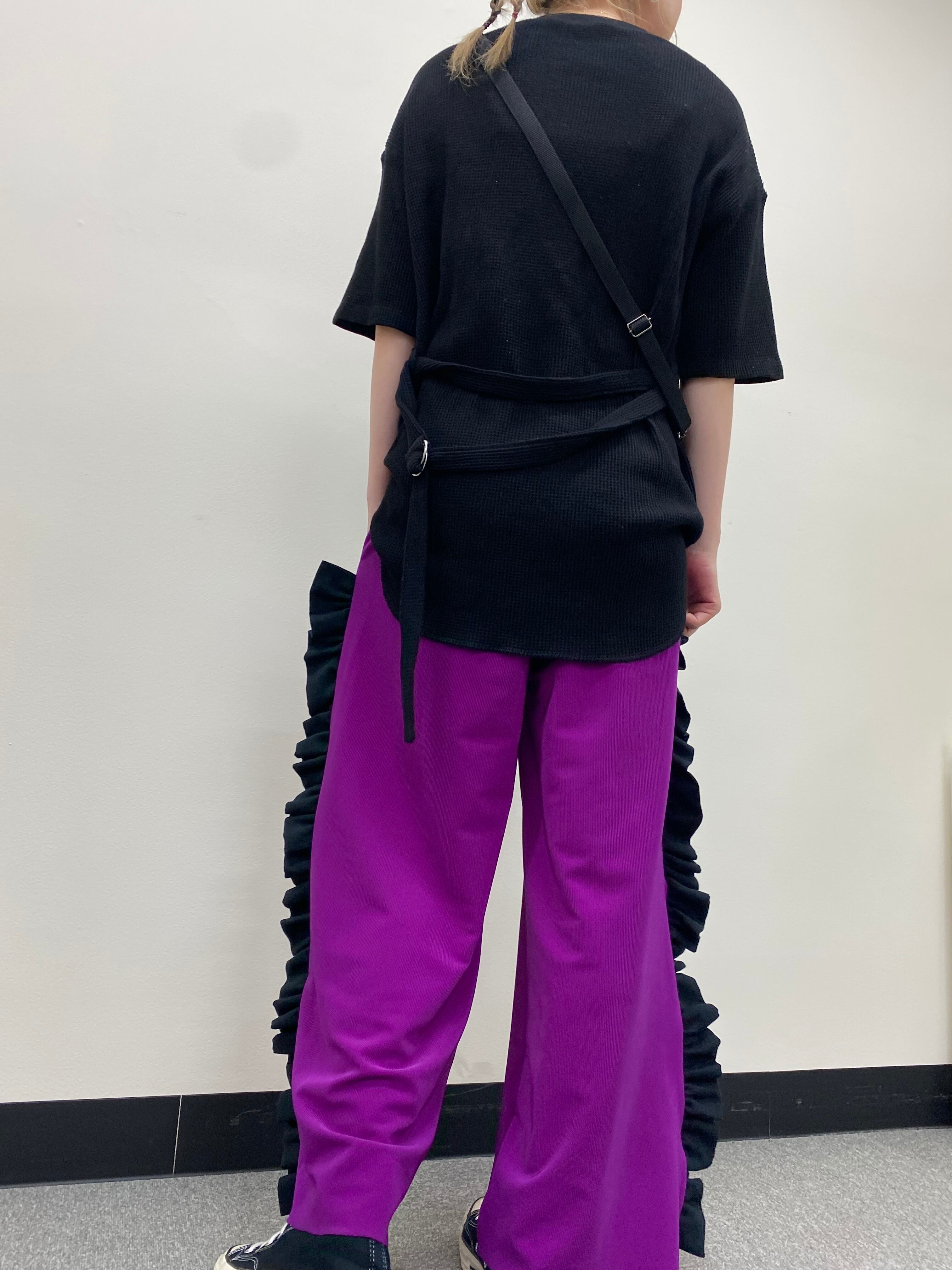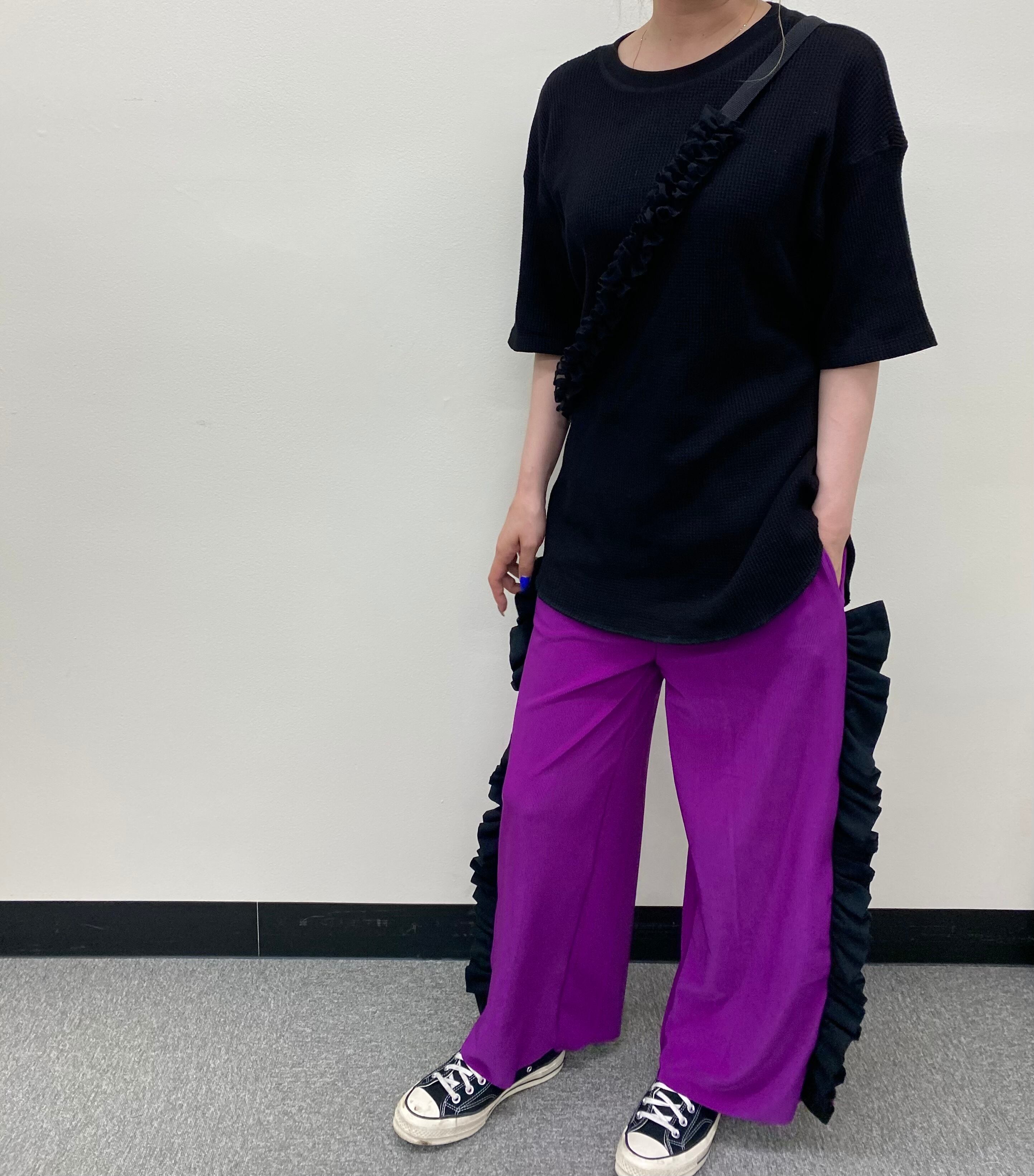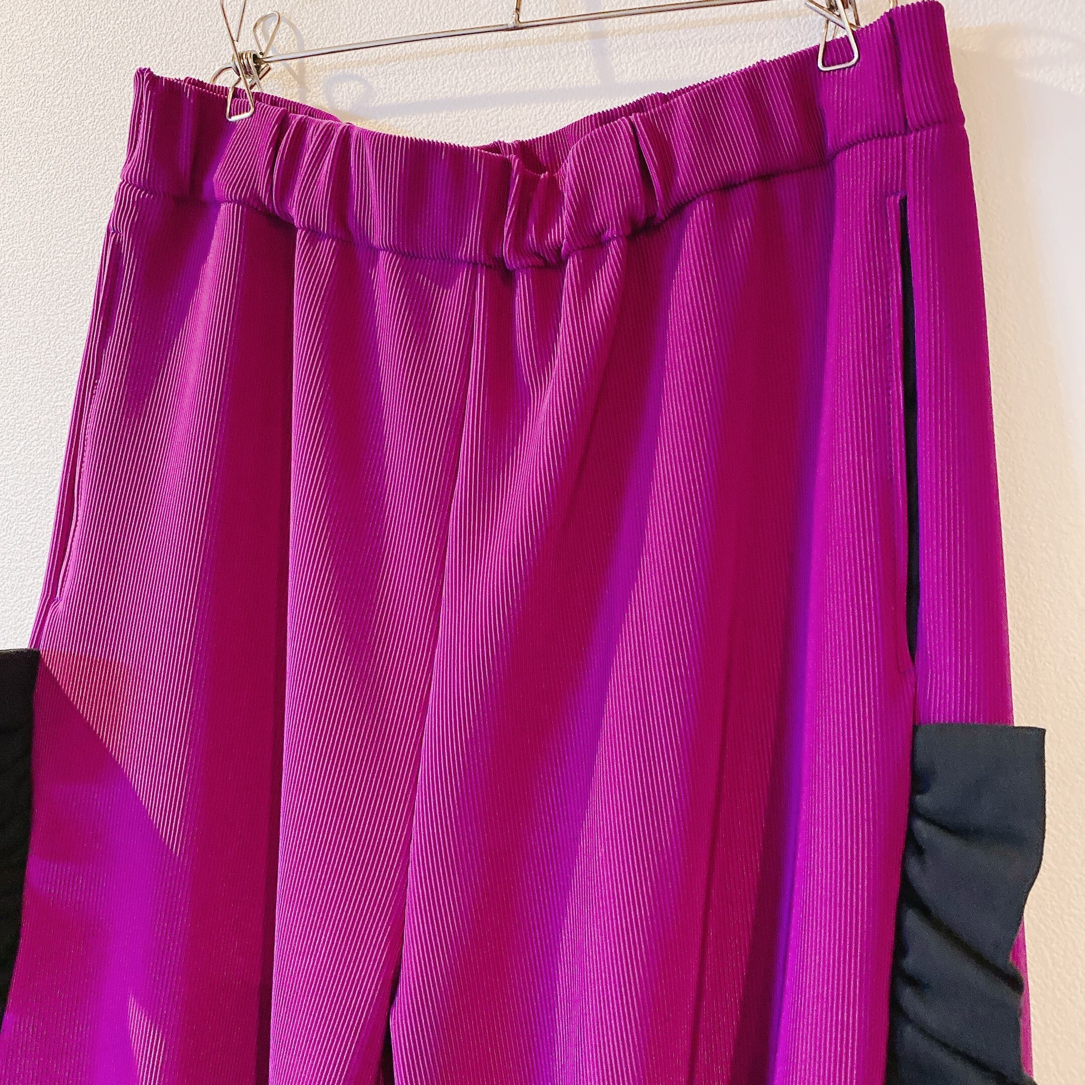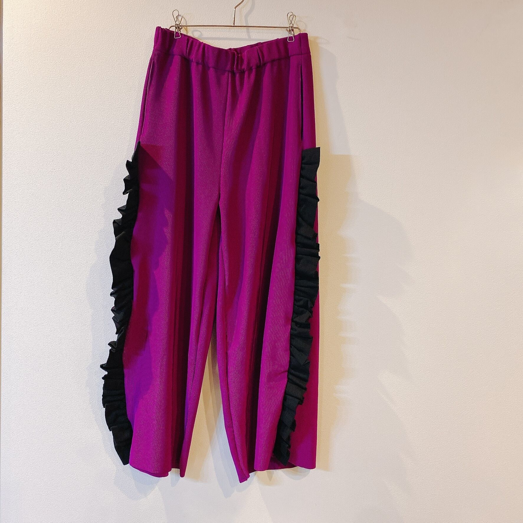 少し光沢のある、とても鮮やかなパープルカラーのフリルパンツです。